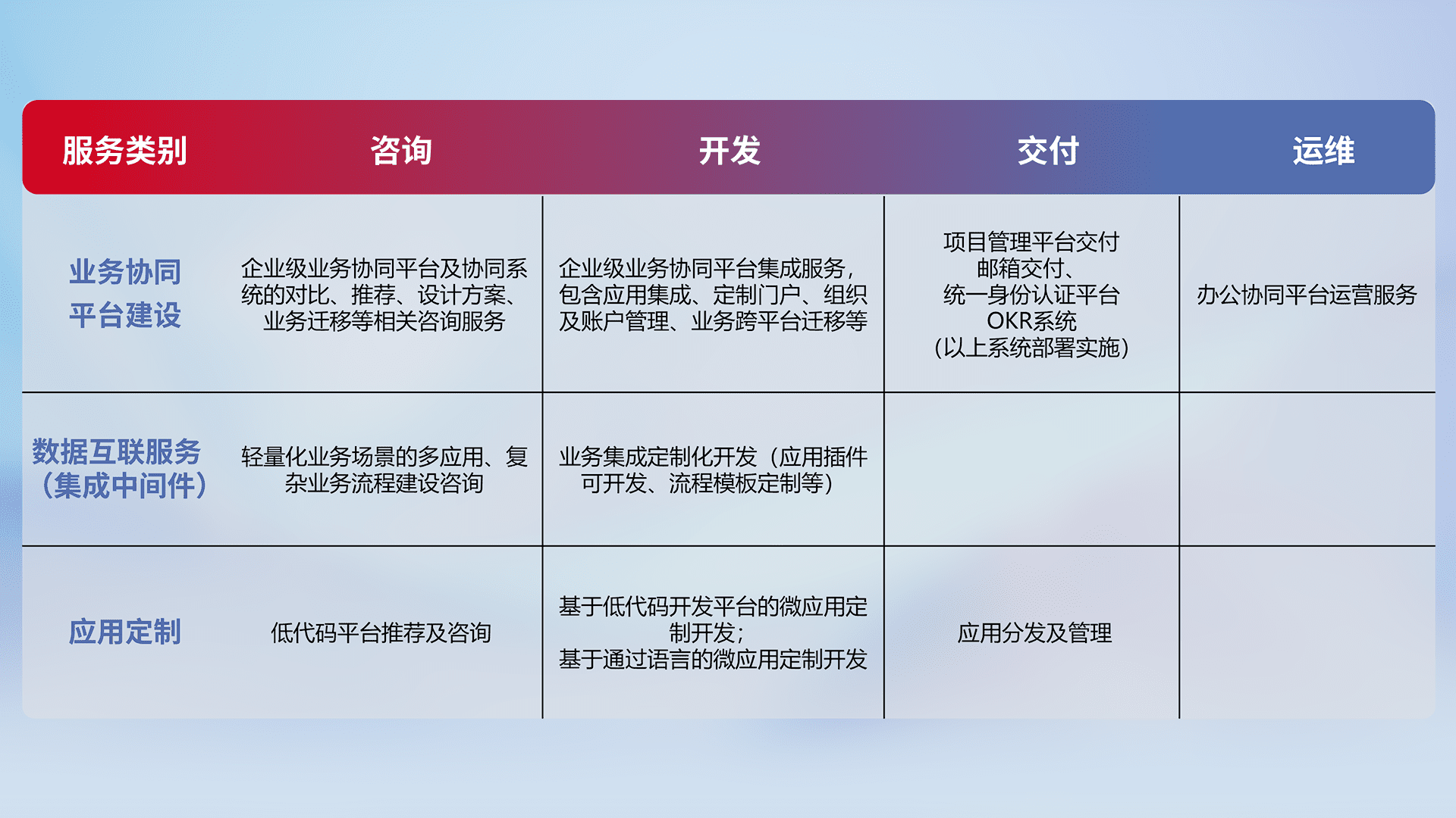 针对钉钉、、企微、、、IDaas等平台级产品提供产品的规划、、、方案、、、、交付、、、、定制化开发等服务,,,实现如统一协同办公、、智能客户服务、、混合会议管理、、、、智能数据查询、、等业务场景,,实现数字化转型。。。。