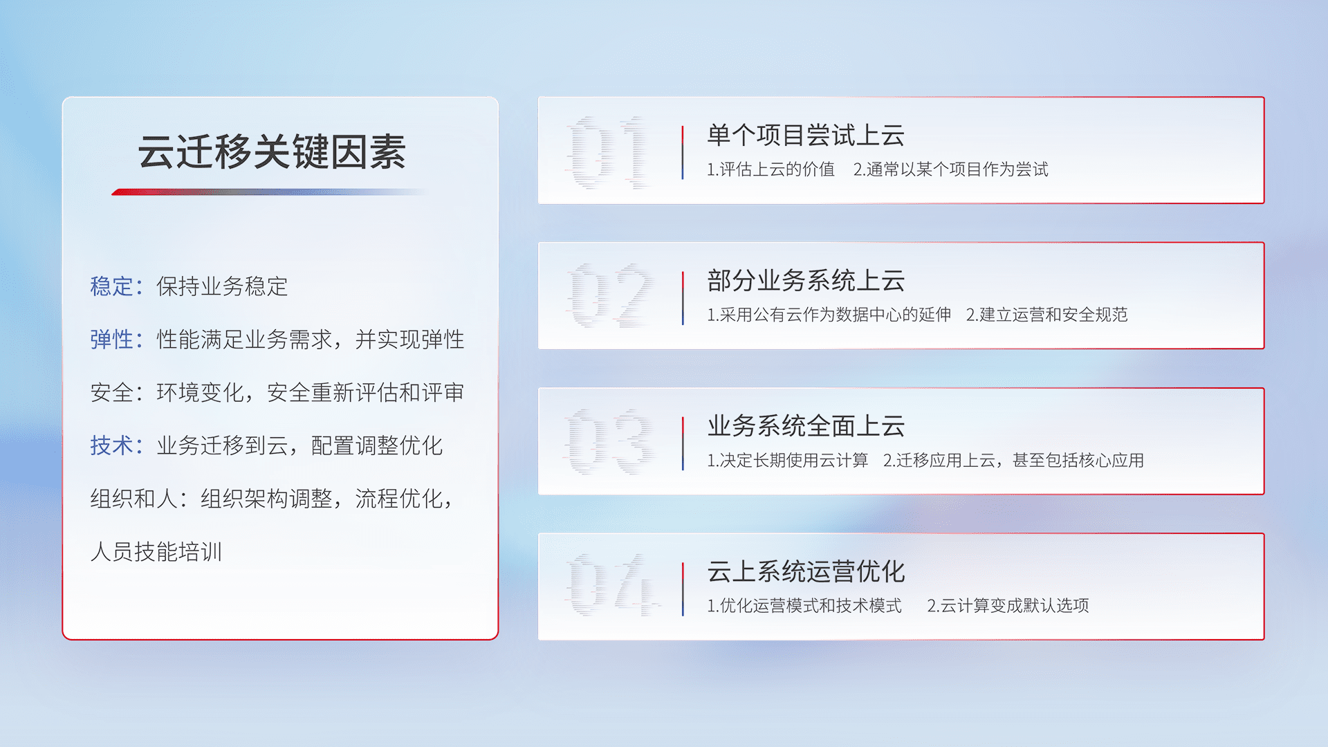 结合实际业务,,,,从规划设计、、云平台选型、、、、云原生改造、、数据迁移、、集成交付,,迁移全过程为客户识别最佳上云路径,,,,做好风险识别管理,,,设计网络架构、、、、身份权限、、安全审计合规、、操作审计、、、日志审计、、、、监控告警策略、、、、多站点容灾设计等,,,,对云上基础设施进行整体规划,,提升IT治理水平,,,,以满足弹性、、、高可用、、高性能的需求。。。