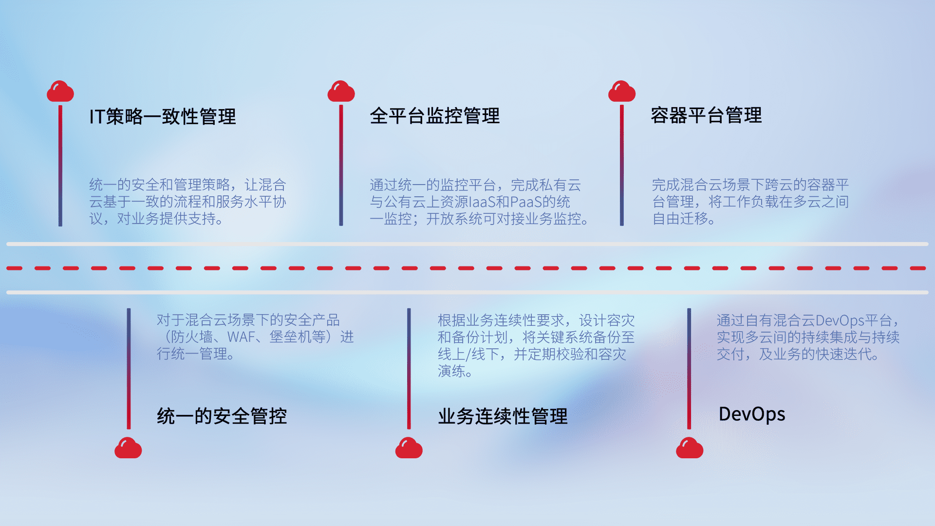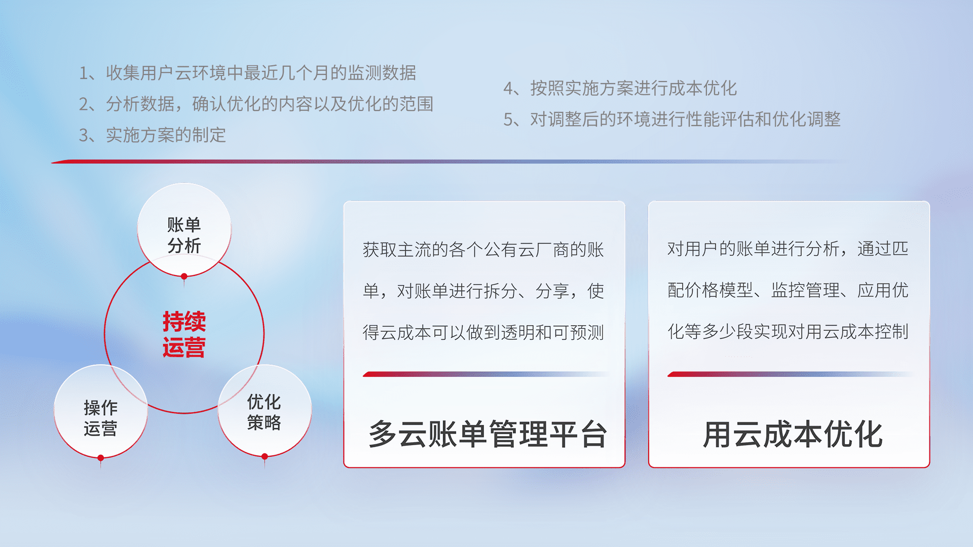 通过多云纳管,,,以统一的资源数据模型把客户的云资源进行抽象和封装,,进而实现对多云资源的统一操作,,,,保障云资源管理的可靠性、、、稳定性与可用性。。。量身定制化运维内容,,,,配置、、、、开发运维、、、补丁管理、、、备份、、、监控、、认证和访问管理、、、审计和日常巡检等,,,,保障在用云过程中的可靠度,,,,稳定度以及高可用率。。。。