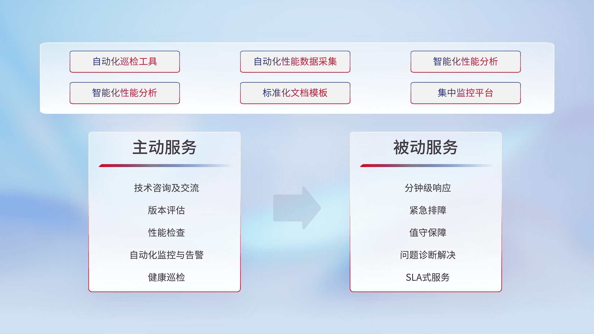 智能化工具和标准化文档,,,,保障服务质量,,,,提供主动服务(包含技术咨询、、、版本评估、、、性能检查、、自动化监控与告警、、、健康巡检)和被动服务包含(分钟级响应、、、紧急排障、、、值守保障、、问题诊断解决、、、SLA服务)。。。